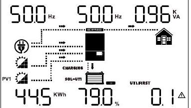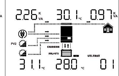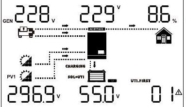 | Mains exist butthe unit works in battery mode. | Input voltage is 0 on the LCD and green LED is flashing. | Input protector is tripped. | Check if AC breaker is tripped and AC wiring is connected well. |