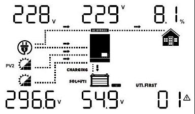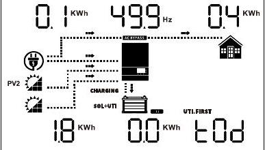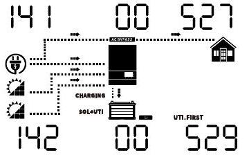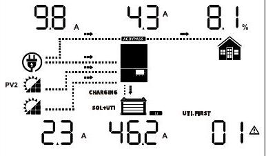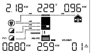 | | Green LED is flashing. | Set "Battery First" or "Solar First" as the priority of output source. | Change output source priority to Utility first. |