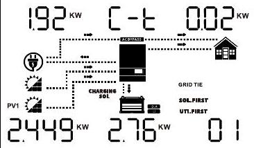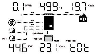 | | | If equalization function is enabled in program 43, this program can be setup. If "On" is selected in this program, it's to activate battery equalization immediately and LCD main page will shows " E ". If "Off" is selected, it will cancel equalization function until next activated equalization time arrives based on program 47setting. At this time, "Eq" will not be shown in LCD main page. | |