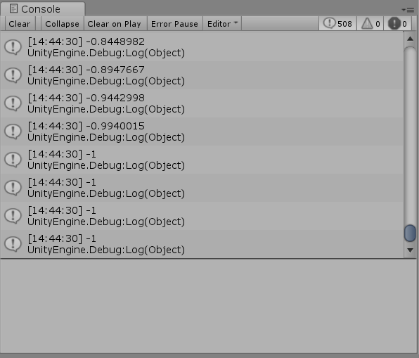 禁用 Collapse 按钮后,各行会连续显示。这是因为 Unity 在每一帧都会调用你的 Update 函数,所以每秒都会写入很多行(取决于 Unity 一秒内生成的帧数)。