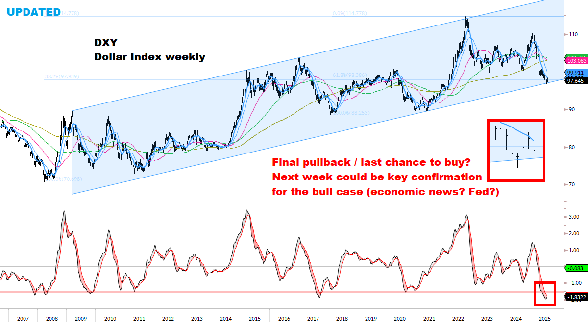If the bottom is confirmed, our minimum target is a Dollar rally back to 103 (or higher):