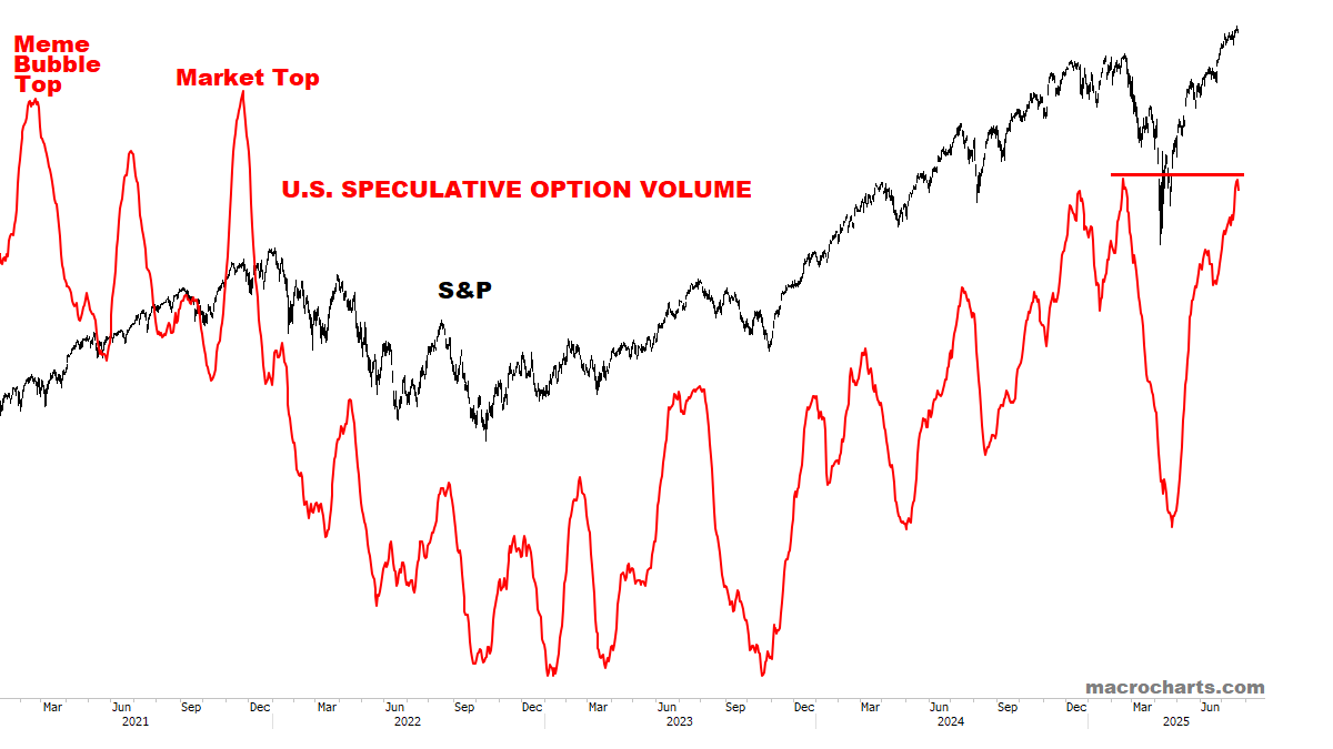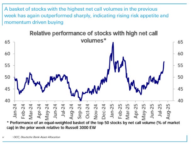 ✅ Below, from DB: “A basket of stocks with the highest net call volumes in the previous week has again outperformed sharply, indicating rising risk appetite and momentum driven buying” (Note the last time at these levels was near the Jan-Feb 2025 peak.)