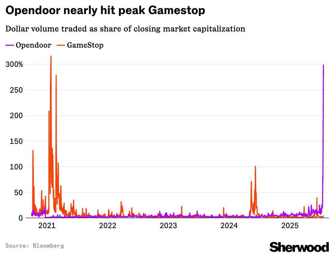 ✅ History doesn’t repeat, but often rhymes — here is a chart with commentary from Luke Kawa (follow him on Twitter/X): “OPEN traded 298% of its closing market cap Monday. That is very close to peak GME, which moved 316% of its market value on January 25, 2021. GME closing peak came two sessions after that.”
