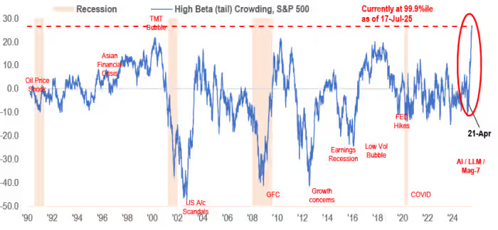 The latest bout of extreme crowding — currently in the 100th percentile — is in high-beta stocks. And this spans both riskier low value alongside speculative growth plays, according to JPM.