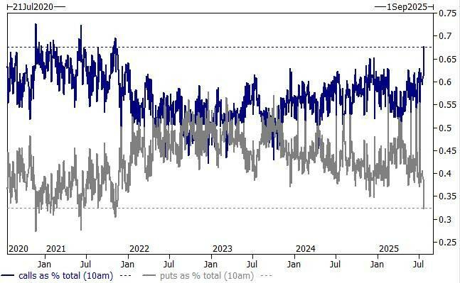 ✅ Below, from GS: “Calls are almost 70% of the total market volume — hasn’t been this high since 2021 meme days”