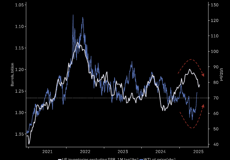 WTI 原油价格与美国原油库存。今天早些时候的完整油市报告附带大量图表,详见此处。