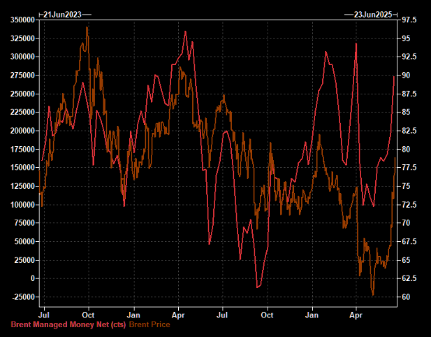 布伦特净管理资金达到五年最大值的 80%(截至 6 月 17 日)。