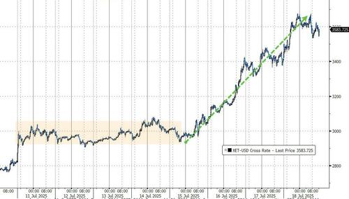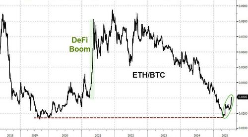Finally, with the success of 'Crypto Week', it appears the digital currencies have finally crossed the Rubicon. As Bloomberg's Brendan Fagan reports, after years of speculative booms and existential regulatory uncertainty, Washington has delivered the crypto space its long-sought legitimacy, and Ethereum, in particular, is reaping the benefits.