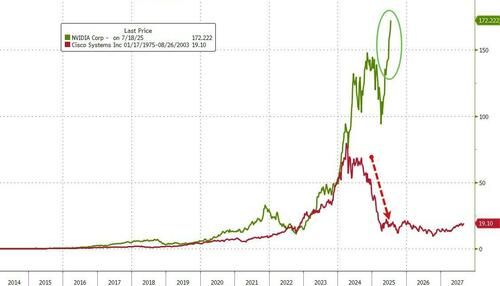 In addition to the better activity data, we are also seeing sustained technology advances taking place even in an environment that in some ways has taken on a more skeptical tone around science. For the week, NVDA shares have gained ~5%, helped by news that it may resume shipments of its sought after GPU's to China as US trade policy evolves (dramatically more bubbly than the CSCO dotcom bubble)...