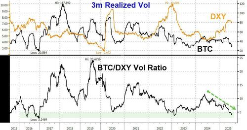 And for all those who claim Bitcoin is just 'too volatile' - the 3-month realized vol of the crytpocurrency is now at its lowest relative to the DXY Dollar Index in over 8 years...
