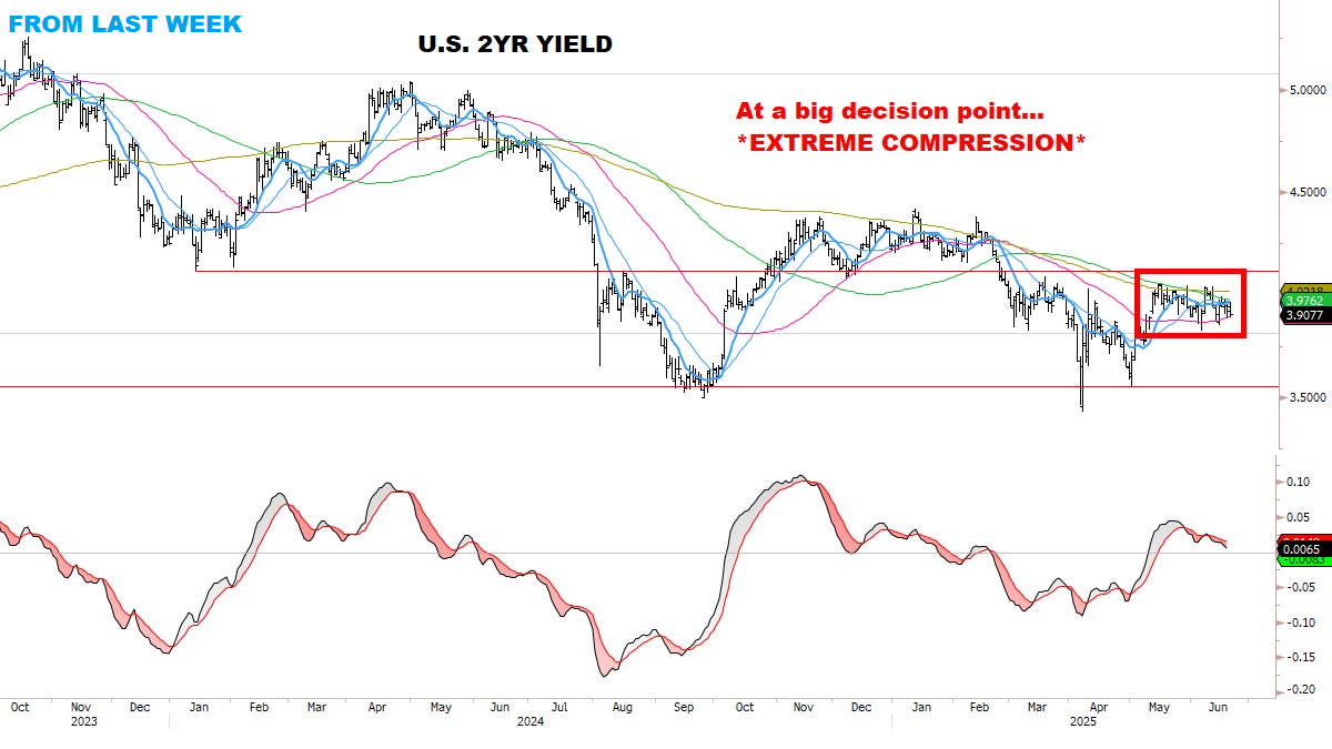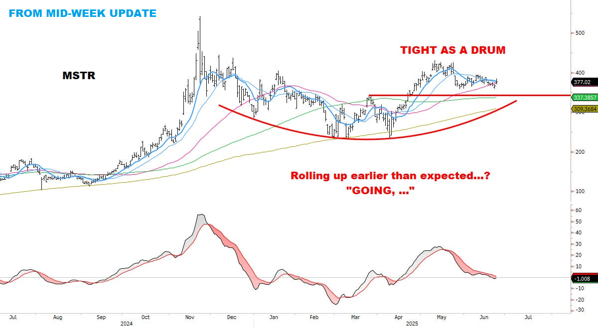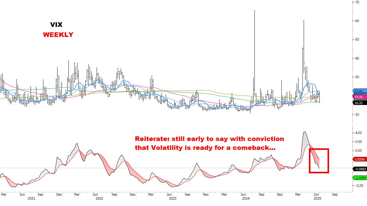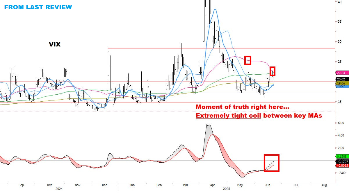 VIX — comments from last week: “forming a tight coil after testing ALL key moving averages. Think this should resolve lower”: