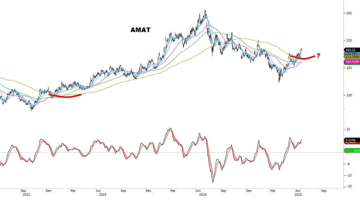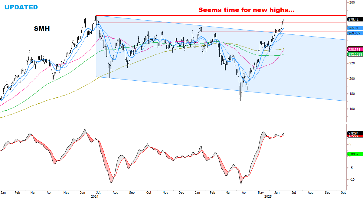 所有主要行业和板块的图表位置依然良好:尤其是半导体、科技、通信服务和软件领域的领头羊。Difficult to build a top while these leading areas continue to carry the market AND are moving in synch.