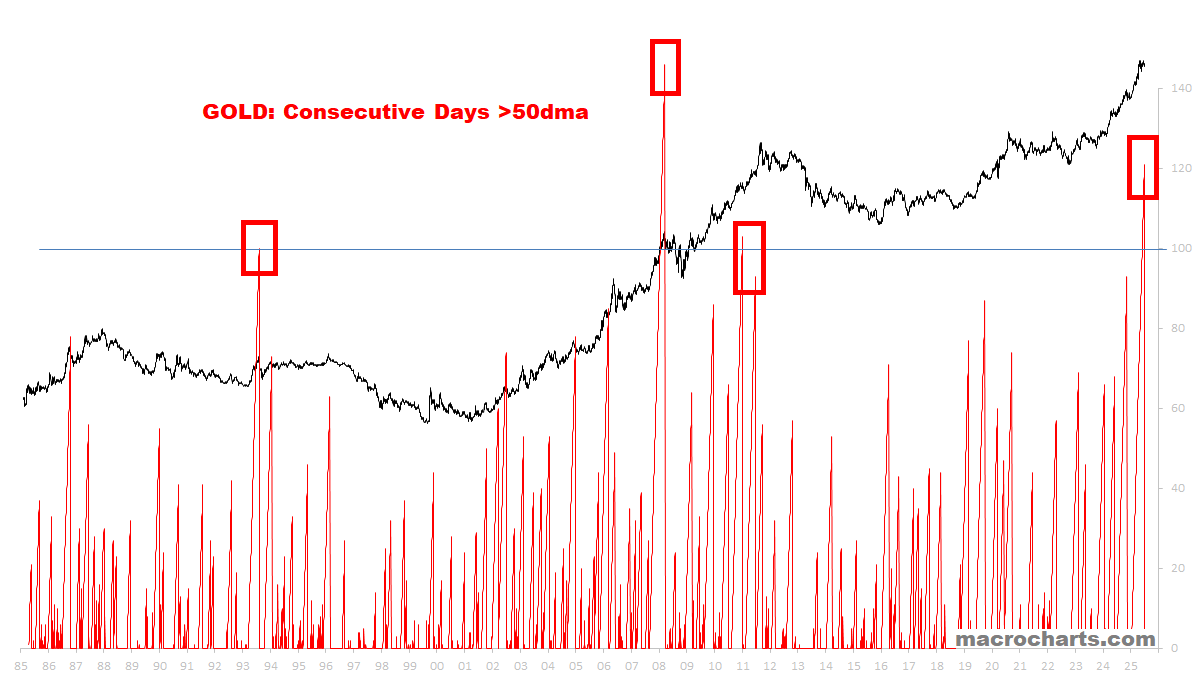 1. Gold was 121 days above the 50dma, and broke down this week.
