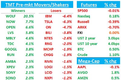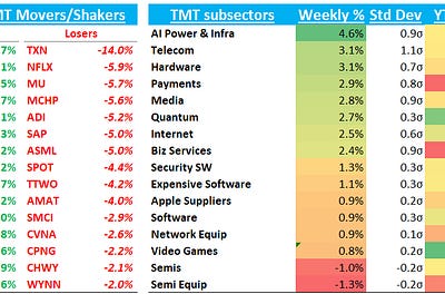 MSFT 因 Azure 的加速增长和指引上涨 4%。我们认为 Azure 在接下来的几个季度将继续加速,但反对意见认为接下来的两个季度将是最好表现,之后 MSFT 将面临显著更严峻的同比比较。这个观点有道理,但我们认为还没到那个阶段。该股继续与 AI 半导体板块走势高度一致。Unlike AI semis, infra names stronger: ORCL +1.6%; NET +3.5%; SNOW +1.6%