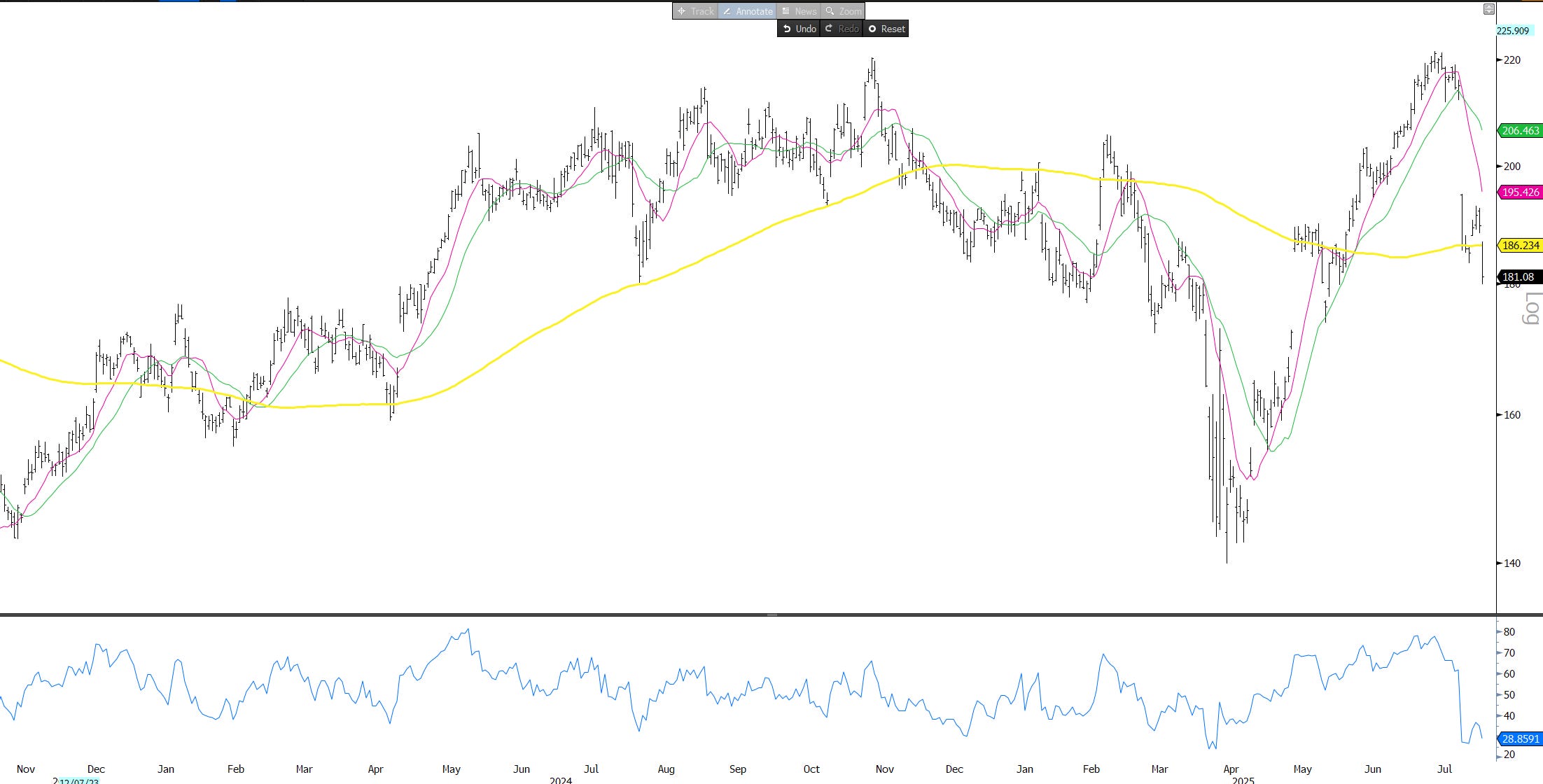 模拟信号尤其疲软:ON 下跌 3.6%;TXN 下跌 3.7%;ADI 下跌 3%;MCHP 下跌 4%。该板块持续走弱。以下是 TXN 的走势图,走势与其他公司类似:
