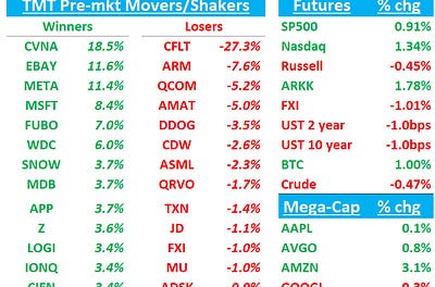 EBAY 上涨 12%,创下 19 个季度以来最大的营收惊喜。3p 数据一直表现积极,但 GMV 同比增长 4%(按可比口径),第三季度 GMC 指引为同比增长 3-5%,超出预期。RDDT +7% helped by META print and also news that GOOGL might be testing a RDDT specific section above the fold - link here