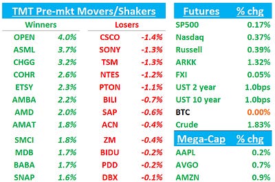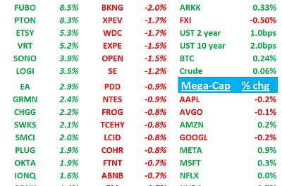 ETSY 上涨 7%,但未能维持财报发布后的涨幅。Outperformance in some China names: VNET +2.5%; GSD +2.5%; BABA +2.4%