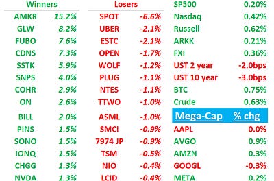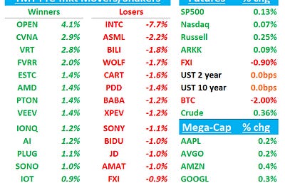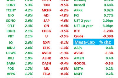部分中国股票表现优异:VNET 上涨 2.5%;GSD 上涨 2.5%;BABA 上涨 2.4%。CVNA +16% on a clean beat and raise
