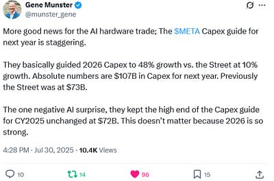 META 上涨 11.5%,创下多年来最佳业绩之一,扎克支持他一直对新员工所说的话:我们的商业模式非常出色,我们可以为你提供所需的任何计算资源。我们今天早上在这里写了我们的看法……GOOGL 下跌 2%,部分原因是 L GOOGL / S META 交易的平仓。RBLX +9%: Even long-time stubborn bear Doug Creutz at Cowen had to admit in the title of his note “That was pretty impressive".” Q2 bookings crushed at 51% y/y and non-GAG games grew +36% helping put a nail in the one-time hit bear case. Mgmt was adamant GAG’s hit status enhanced the success of other games rather than hinder it as 2nd tier games grew 90% y/y. Q3 Bookings +41% at a minimum much better than expected and while Q4 bookings guide implies a decel, we think its just mgmt being overly conservative and think its possible bookings could grow 50% 3 straight quarters. Yes, we all know comps get harder in CY26, but that’s a story for another time. In the meantime, stock continues to get re-rated higher. It’s a similar story to what happened to CVNA over the last several years where the shareholder base/perception of stock did a 180 — RBLX is no longer a 3p data tracking stock, but investors are appreciating the more durable nature of tailwinds. And that’s not to mention most tailwinds haven’t even really ramped: SHOP partnership, GOOGL Ad partnership, AAPL app store chg tailwinds, AI vibe content creation, IP License Manager, etc.